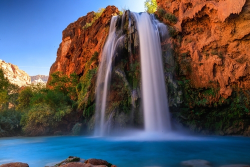 Reaching the falls requires a long hike or helicopter ride, which makes the destination feel even more remote. Red canyon walls surround the bright water, creating an almost unreal contrast. Palm trees and cottonwoods line the creek in places. It feels far more like an oasis in Mexico than northern Arizona.